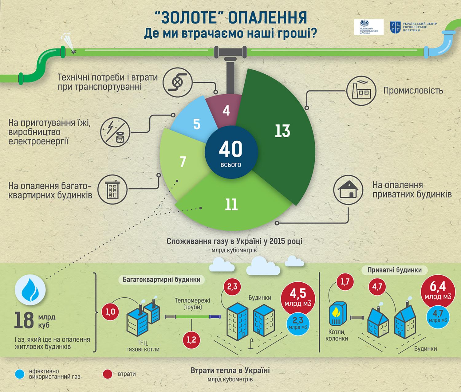 При этом энергоемкость ВВП Украины почти вчетверо превышает среднеевропейский показатель. По результатам 2014–2015 гг., население является крупнейшим отдельным потребителем газа в Украине, на которое приходится около 50% от общего объема и которое в основном использует его для обогрева собственных домов (45% от общего объема). К тому же 60% из 18 млрд кубометров, сжигаемых для обогрева домов (как частных, так и многоэтажек через системы централизованного отопления), теряется из-за неэффективных котлов, изношенных теплотрасс и крайне плохой термоизоляции домов, а также недостаточной изоляции стен, окон, крыш и домовой двери. Поэтому именно населению придется взять на себя основное финансовое бремя инвестиций в энергосбережение в жилищном секторе.