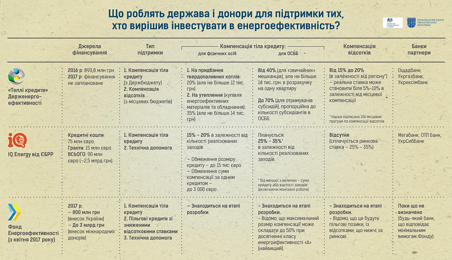 В октябре 2014 г. Государственное агентство по энергоэффективности и энергосбережению (Госэнергоэффективности) задействовало первую системную программу софинансирования мероприятий по энергоэффективности для населения - программу "Теплые кредиты". Она предусматривает довольно простой механизм софинансирования для домохозяйств в виде получения целевого займа на приобретение энергоэффективных материалов и оборудования в одном из трех государственных банков: Ощадбанке, Укргазбанке или Укрэксимбанке. Программа включает компенсацию со стороны государства части этого кредита - от 20 до 40%. Процент госкомпенсации зависит от типа заемщика (частные или юридические лица, а именно - ОСМД или жилищно-строительные кооперативы, ЖСК) и типа инвестиций (замена газовых котлов в частном секторе на альтернативные, не использующие газ и электроэнергию в качестве источника энергии).