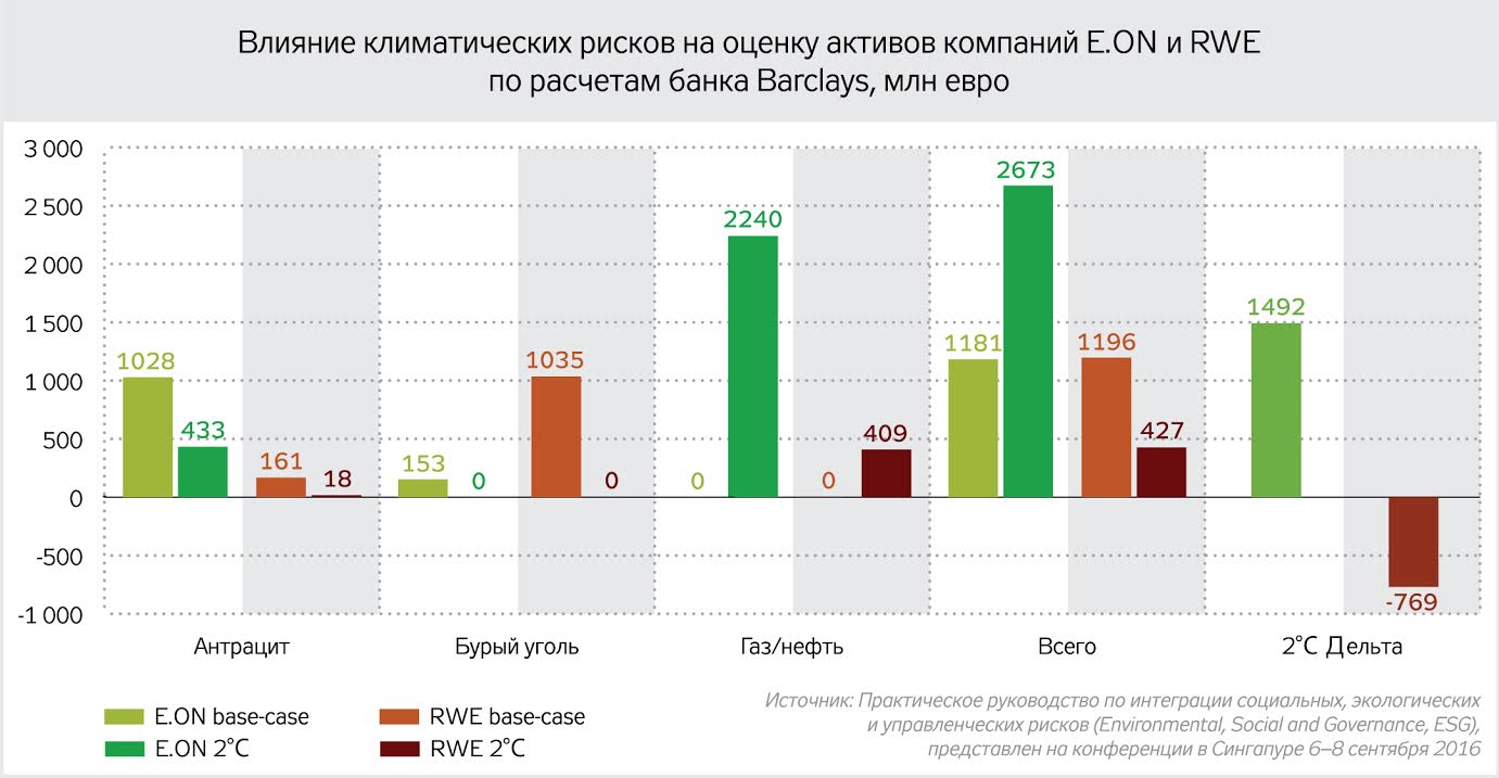 Так, согласно расчетам британского банка Barclays, сокращение выбросов парниковых газов с целью удержания темпом глобального потепления в пределах 2 градусов Цельсия потребует от обеих компаний применения стратегии замены угля природным газом для производства электроэнергии и повышения доли возобновляемой энергии в общей структуре ее генерирования. С учетом изменения цены европейских квот на выбросы парниковых газов (European Emission Allowances, EUA) стоимость активов компании E.ON будет положительно отличаться в случае движения в пределах стратегии удержания темпов потепления на планете в пределах двух градусов Цельсия.