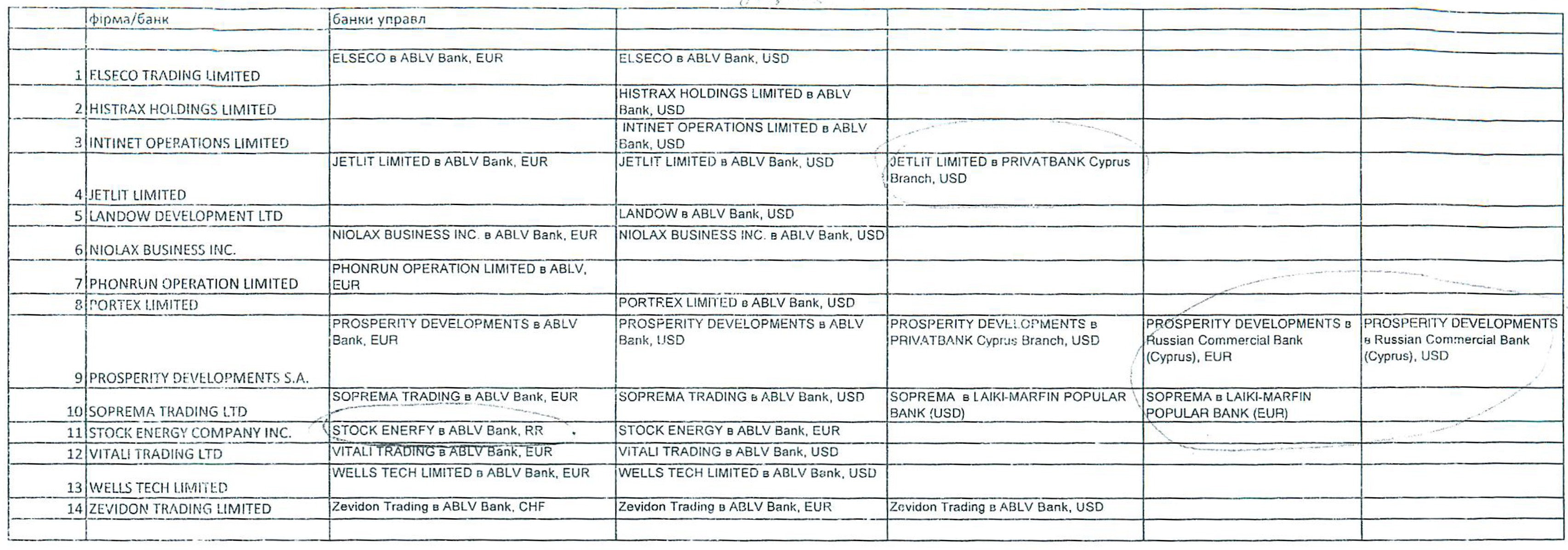 Мы получили перечень офшорных компаний, через которые по состоянию на 2013 г. прогоняли миллиарды гривен из корпорации Курченко. Вот они: Elseco Trading Limited (?), Histrax Holdings Limited (Кипр), Intinet Operations Limited (?), Jetlit Limited (Кипр), Landow Development LTD (?), Niolax Business INC.(?), Phonrun Operation Limited (Кипр), Portex Limited (Багамские острова), Prosperity Developments S.A. (Панама), Soprema Trading Ltd (Британские Виргинские Острова), Stick Energy Company INC.(?), Vitali Trading Ltd.(?), Wells Tech Limited (Гонконг), Zevidon Trading Limited (Белиз).