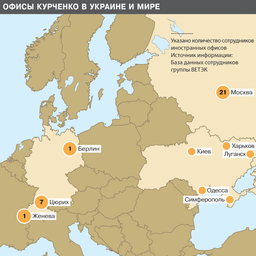 "Нам было запрещено общаться между собой во время работы. А когда идешь домой, должен был все убрать со стола, брать что-либо домой запрещалось", - рассказывает бывший сотрудник компании Курченко ВЕТЭК. Судя по полученной нами базе данных сотрудников, в последнее время на молодого олигарха работало свыше 640 человек. Речь идет о лицах преимущественно менеджерского звена, принимавших какие-то решения. Интересно, что едва ли не половина из них - ровесники Курченко, не старше 30 лет. Только в PR-отделе ВЕТЭК работало 15 сотрудников. Кроме украинских, у бизнесмена были офисы в Женеве, Цюрихе, Берлине... И самый многочисленный - в Москве, там на него работал 21 человек.