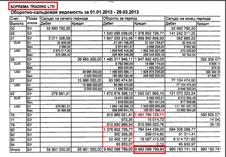 Получив документы, мы увидели, что действительно Soprema Trading Ltd имела огромные денежные обороты, чтобы самой предоставлять кредиты кому угодно. Например, согласно оборотно-сальдовой ведомости, только в первом квартале 2013 г. общий итог деятельности компании составил 9,662 млрд грн. По другим документам видно, что Soprema Trading Ltd. торговала нефтепродуктами. За три месяца было продано товара на более чем 1,4 млрд грн. Но себестоимость товара, транспортные и административные расходы составляли почти такую же сумму. В итоге чистая прибыль равнялась только 134 тыс. грн. Любой бизнесмен понимает, что такая прибыль просто смешная, если учитывать затраты на деятельность. В реальности такой бизнес, когда цена реализации почти не отличается от себестоимости продукции, просто не имел бы смысла.