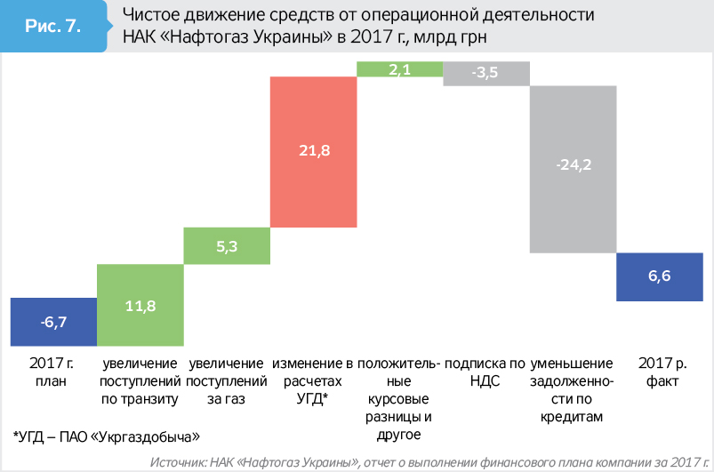 При этом, анализируя чистое движение средств от операционной деятельности, в "Нафтогазе" отмечают: "Увеличение… объясняется тем, что увеличились поступления от услуг за транзит; …за счет увеличения в Госбюджете субсидий увеличились поступления за природный газ (+5260 млн грн); уменьшилась по отношению к плану оплата ПАО "Укргаздобыча" за газ и не была осуществлена запланированная покупка оборудования для УГД, что в целом привело к росту чистого денежного потока от операционной деятельности на 21 772 млн грн" (см. рис. 7).
