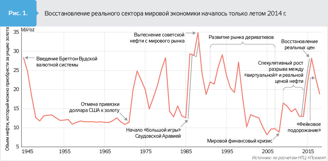 Золото на протяжении веков было общепризнанным средством сохранения богатства. Этот драгоценный металл всегда позволял более или менее объективно оценить остальные товары. Поэтому сравнение с ним поможет нам понять, сколько стоит кровь современной экономики сегодня, и сколько она стоила в прошлом (рис. 1). Например, в 1949–1970 г. за тройскую унцию (31,1035 г) драгоценного металла можно было приобрести приблизительно 12 баррелей нефти, в разгар войны за вытеснение советской нефти с рынка - 35 баррелей. С последовательным уменьшением в 2014–2016 гг. спекулятивной составляющей в котировках за одинаковую навеску золота можно было покупать все больше нефти (до более 40 баррелей в феврале 2016-го).