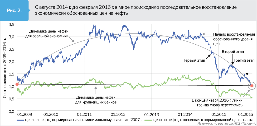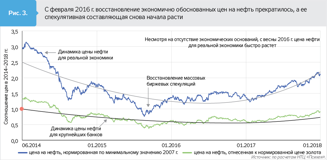 К чему же все это привело? Если в 2014–2016 гг. в мире происходило последовательное восстановление экономически обоснованных цен на нефть, благодаря чему нормированные котировки черного золота для реальной экономики и крупнейших банков сравнялись (рис. 2), то с весны 2016-го финансовые спекуляции возобновились (рис. 3). На рынке надувается новый пузырь, и цена нефти для реальной экономики быстро пошла вверх, несмотря на отсутствие для этого фундаментальных экономических предпосылок.