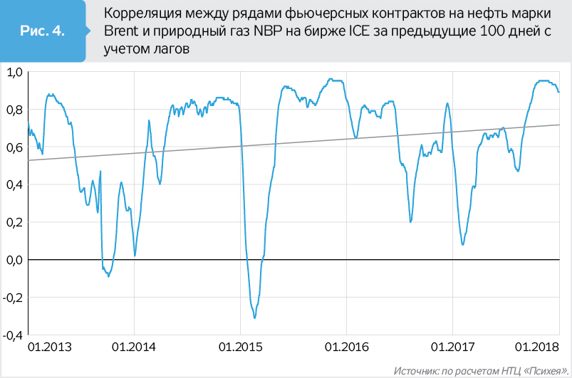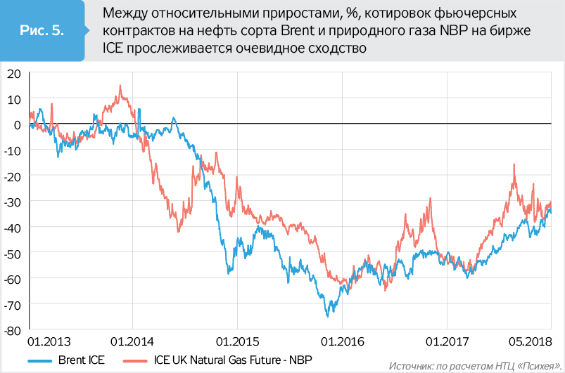 Впрочем, между котировками NBP и Brent уже прослеживается заметная связь (рис. 4). Зависимость между рядами фьючерсных контрактов на нефть сорта Brent и природный газ NBP на бирже ICE Futuries, которую можно выразить через коэффициент корреляции, достигает 0,84 (при теоретическом максимуме 1,00). То есть ценовые тренды для ископаемых энергетических ресурсов схожи, хотя и существует ряд факторов (например, сезонность), предопределяющих разное поведение котировок в краткосрочной перспективе.