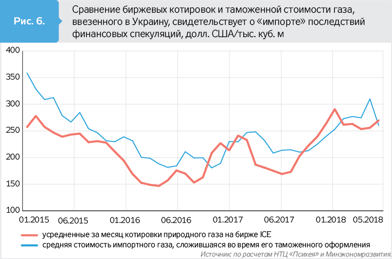 Таким образом, искусственная привязка цен природного газа в Украине к его биржевым котировкам или спотовым ценам в Европе после завершения действия экспортного контракта 2009 г. может привести к "импорту" последствий финансовых спекуляций. Об этом свидетельствует, в частности, сравнение биржевых котировок NBP на бирже ICE Futuries и средней таможенной стоимости природного газа, ввезенного в Украину после прекращения его прямых поставок из РФ (рис. 6).