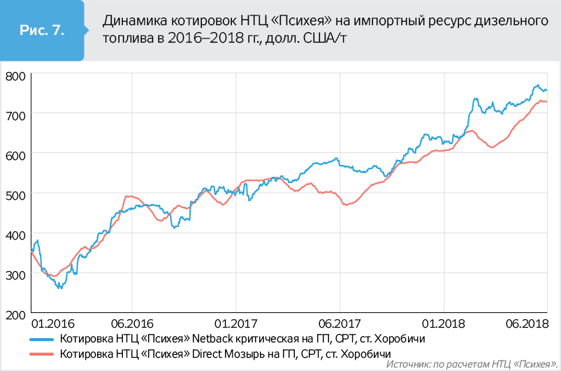 Сравнение расчетных индикаторов цен контрактов на поставки импортных нефтепродуктов и показателей netback, рассчитанных по розничным ценам, подтверждает связь между стоимостью топлива на внешнем и внутреннем рынках (рис. 7, 8).