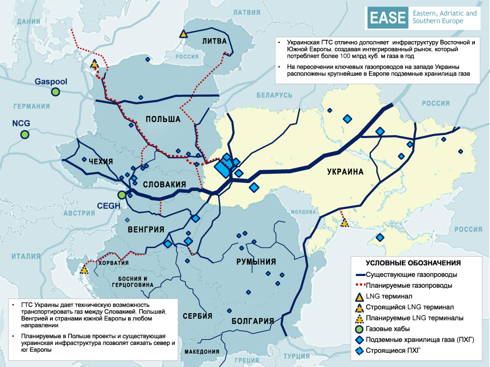 По участию Украины в европейских инфраструктурных проектах руководители Минэнерго и "Нафтогаза" провели не один десяток встреч с европейскими чиновниками, политиками и компаниями. Мы обсуждаем, в том числе, возможность создания газового хаба на базе украинских подземных хранилищ газа. Благодаря своему расположению и существующей газотранспортной инфраструктуре, которая по большинству параметров является мощнейшей в Европе, Украина способна сыграть важную роль в укреплении энергетической безопасности Европы. Используя нашу инфраструктуру, европейцы смогут диверсифицировать ресурсную базу и маршруты доставки энергоресурсов, в частности с Каспия. Более того, технические решения, предлагаемые Украиной, способны существенно улучшить большинство проектов расширения инфраструктуры в Восточной и Юго-Восточной Европе (в частности в Румынии), а местами, как в случае с Eastring, и вовсе заменить их, сократив при этом затраты компаний-операторов ГТС в государствах Евросоюза на реализацию таких инфраструктурных проектов.