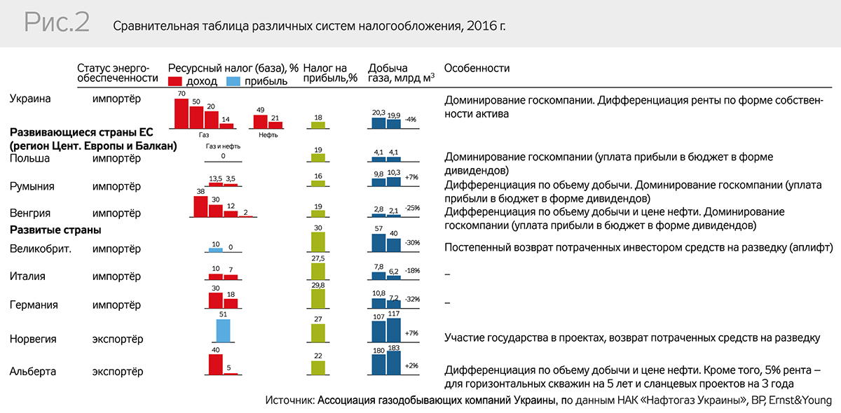 По данным отчета международной аудиторской компании Deloitte, действующее налоговое бремя в виде огромной ресурсной ренты делает газодобывающую отрасль Украины неконкурентной в борьбе за инвестиции в Европе. Сухие цифры свидетельствуют, что средняя эффективная ставка ресурсного налога в европейских странах составляет менее 10%. Больше всего (22,9%) платили предприятия в Венгрии, тогда как по остальным государствам-импортерам фискальное бремя не превышает 15%. Даже второй в мире экспортер природного газа, Норвегия, применяет меньшую фискальную нагрузку, нежели государство-импортер Украина, в которой добываемая нефть в основном облагается по ставке 45%, природный газ - 50 и 29%, а с учетом договоров совместной деятельности - 70%.