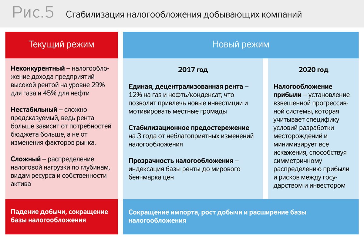 Именно поэтому вслед за первоочередной стабилизацией налогового режима с помощью его упрощения, повышения прозрачности и снижения рентной ставки до конкурентного уровня (9–12%) с отчислением ее части непосредственно региональным громадам следующим принципиально важным аспектом является постепенный переход на более экономически эффективное налогообложение, которое будет адекватно реагировать на различия в экономических условиях на разных объектах разработки и на их изменения во времени.