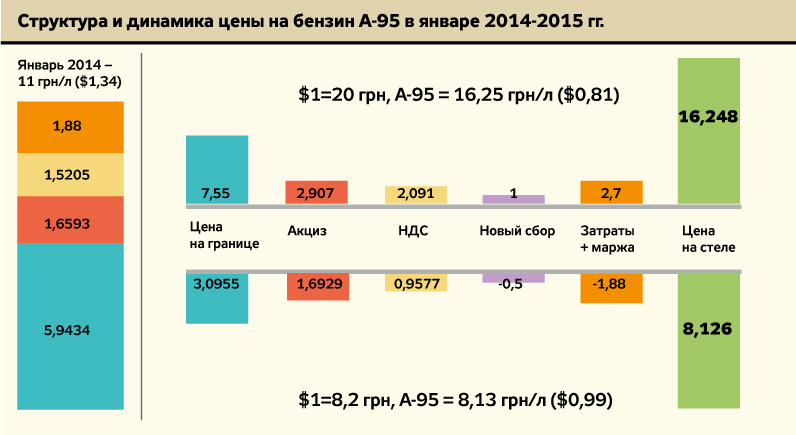 И это еще далеко не все. С января 2015 г. Кабмин под шумок принятия госбюджета-2015 ввел дополнительный 5-процентный сбор с розничного оборота подакцизных товаров, который следует перечислять в местные бюджеты. С учетом особенностей начисления этого налога к себестоимости топлива необходимо прибавить еще около 1 грн/л. Это значит, что за счет девальвации, увеличения существующих и введения новых налогов себестоимость бензина в январе
