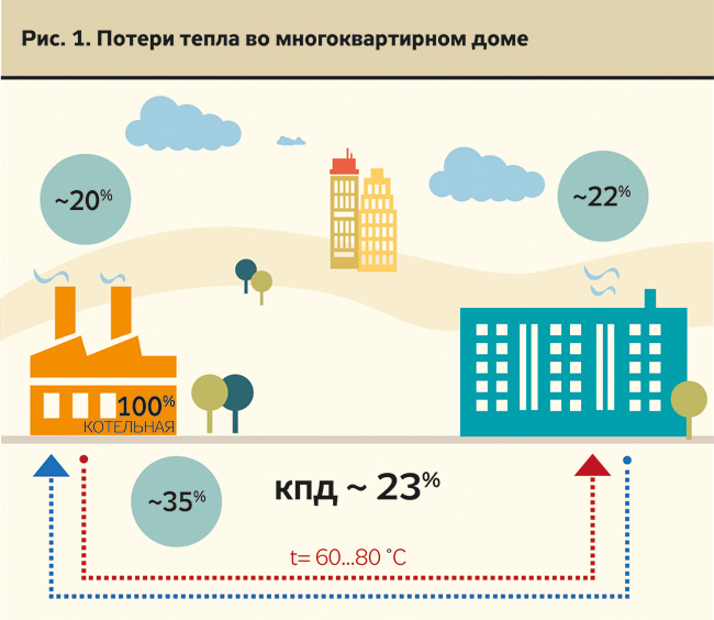 Из всей энергии, поступающей в котельную в виде энергоносителя, непосредственно для обогрева жилых домов используется не более 23% (здесь и далее приведены усредненные значения, в каждом конкретном случае цифры могут немного отличаться).