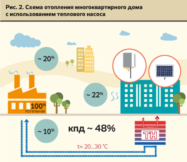 Схема теплоснабжения многоквартирного дома с использованием тепловых насосов позволяет повысить надежность работы системы и существенно снизить затраты жильцов на отопление. Появляется возможность управлять как системой теплоснабжения, так и финансовыми потоками при оплате услуг.