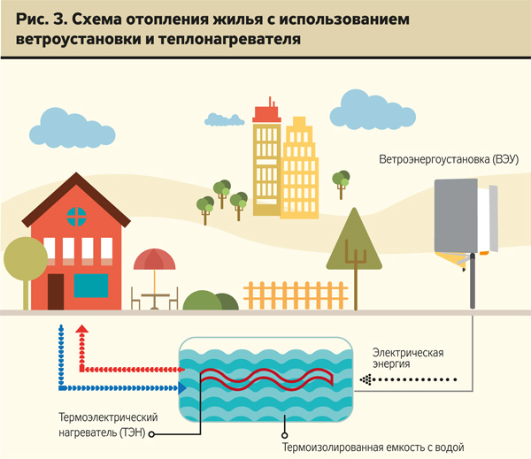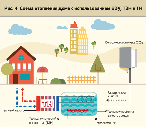 Таким образом, в представленной на рис. 3 схеме показано, как кинетическая энергия воздушного потока преобразуется в тепловую энергию воды системы отопления дома. В процессе эксплуатации такой системы отопления жилого дома электроэнергия, вырабатываемая ВЭУ, используется для пополнения запаса тепловой энергии в термоизолированной емкости.