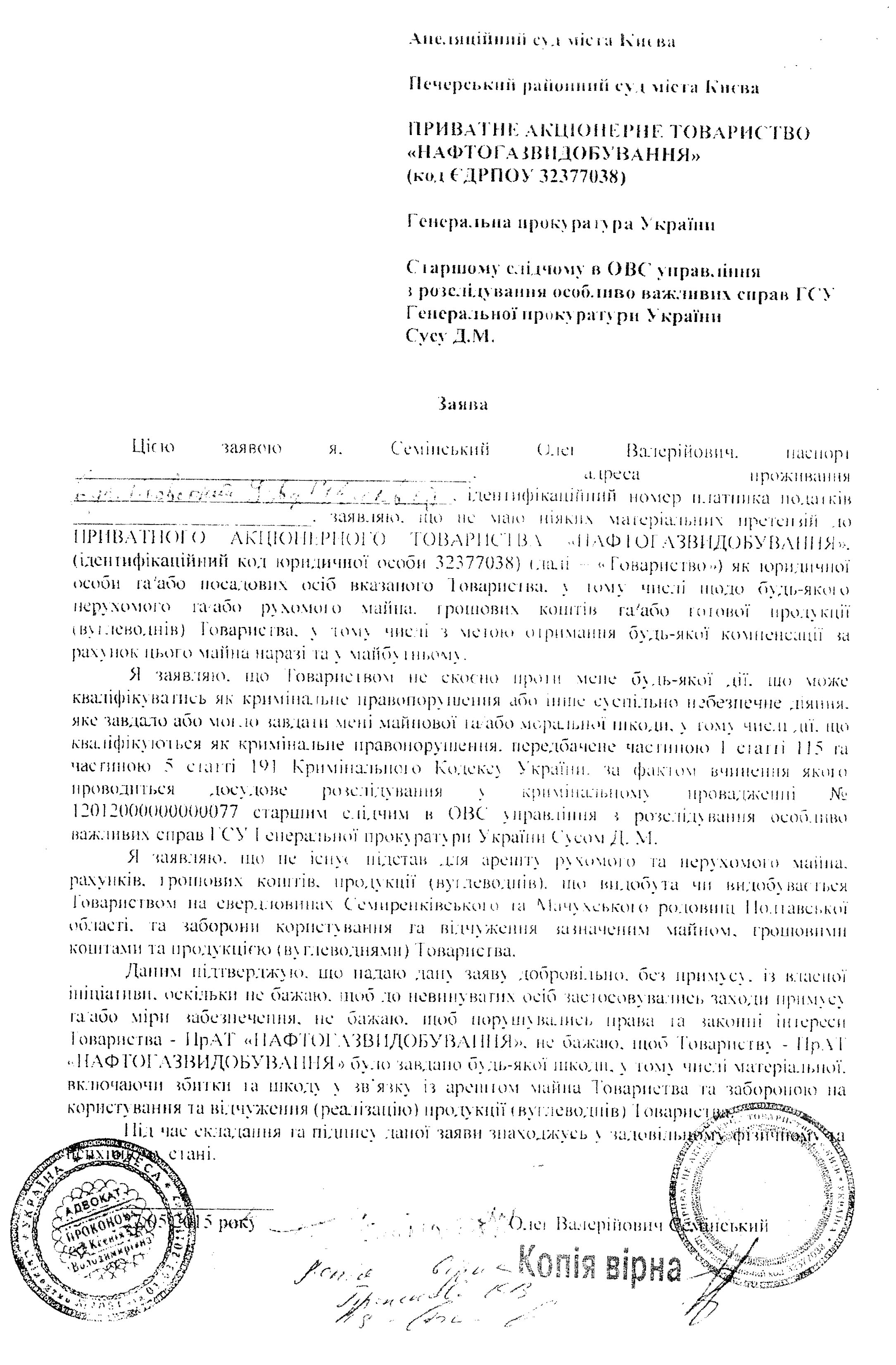 - Да, действительно, я подписал заявление о том, что не подозреваю ЧАО "Нефтегаздобыча" в совершении преступления против меня (см. заявление). Исключительно переживая о судьбе компании, в которую я вложил столько сил и здоровья.