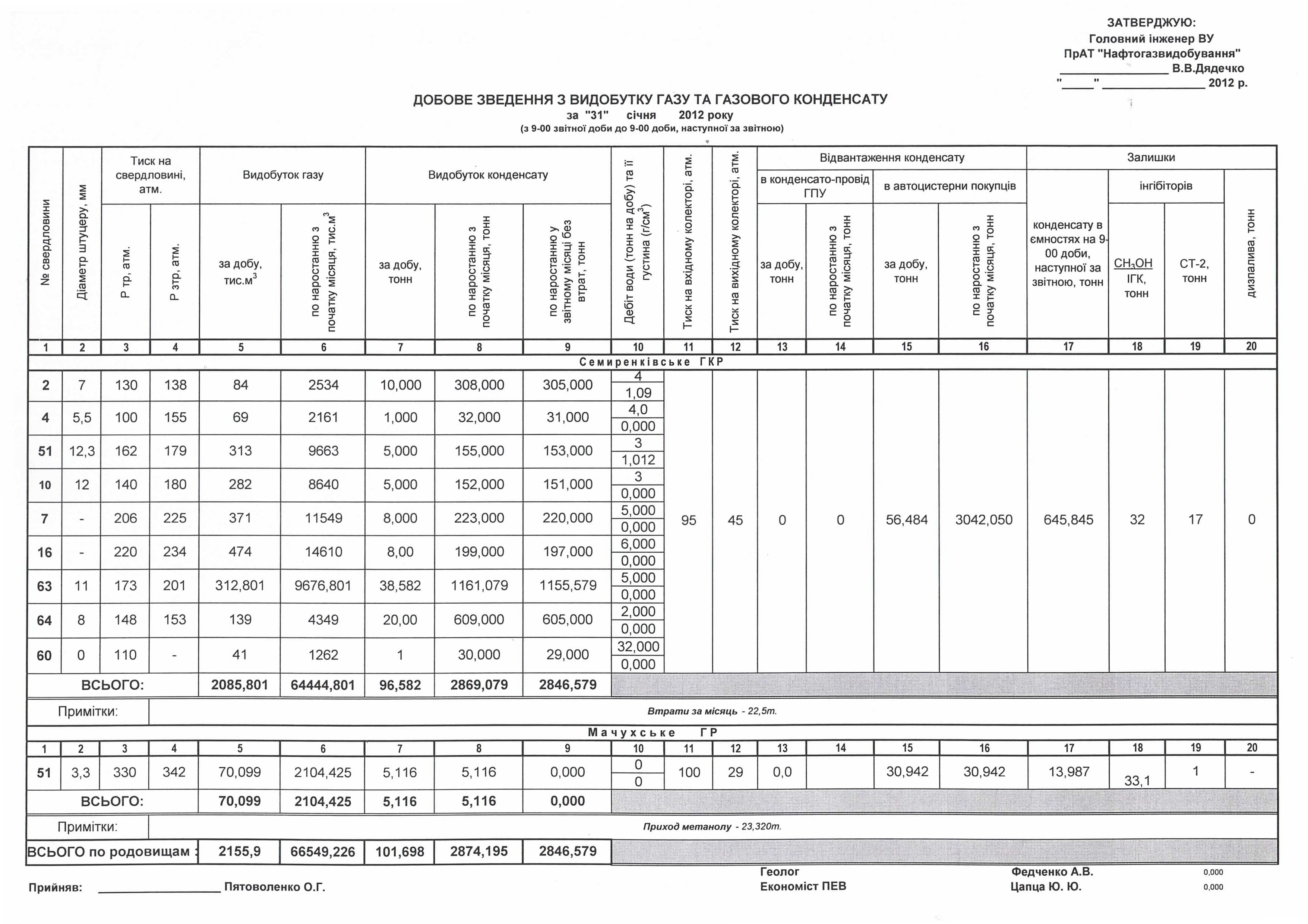 На конец 2011 г. среднемесячный объем добычи продукции составлял: природного газа - 65 млн кубометров, газового конденсата - 2,8 тыс. т.