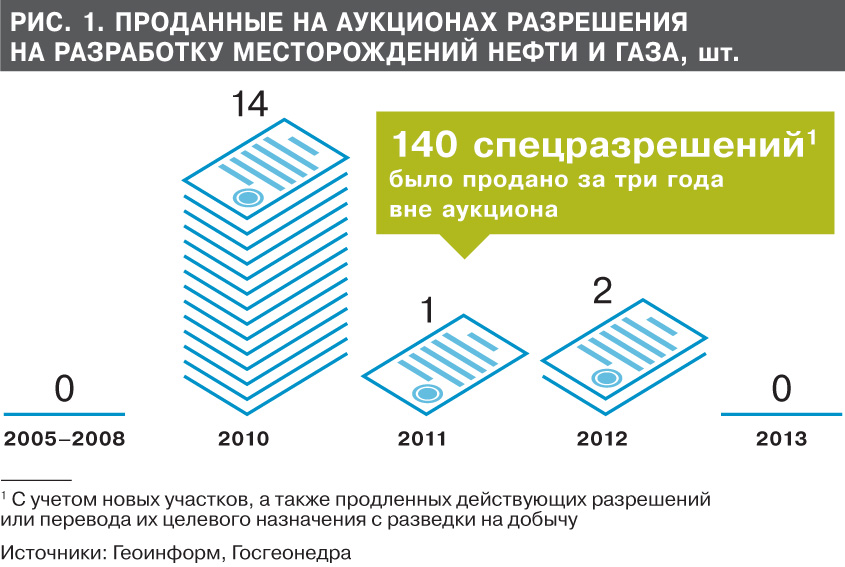 Участники рынка одобрительно оценивают такую долгожданную инициативу государства, однако высказывают серьезные сомнения в эффективности ее практической реализации. Скептицизм объясняется многолетней практикой проведения аукционов в Украине. Так, на протяжении 2011–2013 гг. на открытых торгах было продано лишь три спецразрешения на разработку нефти и газа. При этом по внеаукционной процедуре (используя разнообразные уловки в законодательстве) в пользу частных, и в основном малоизвестных компаний были "втихую" проданы около сотни разрешений на новые участки (см. рис. 1).