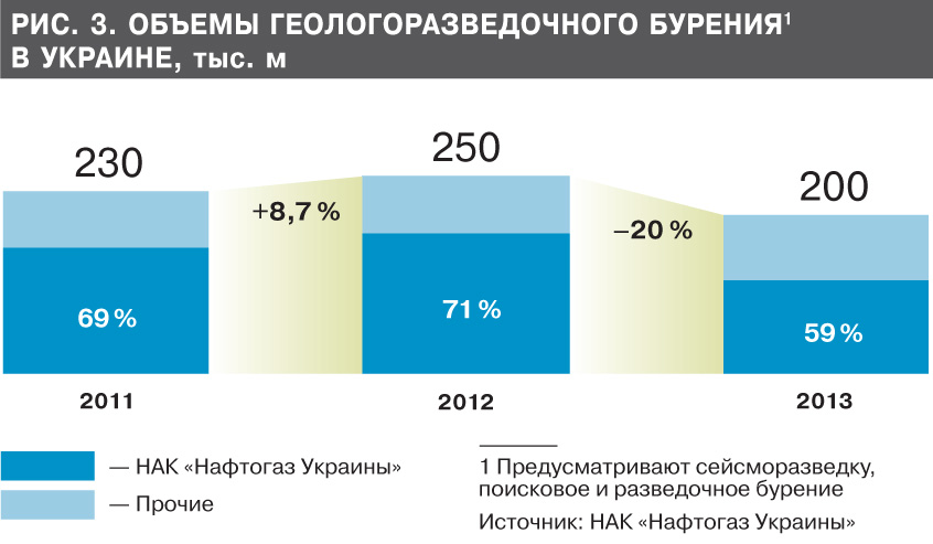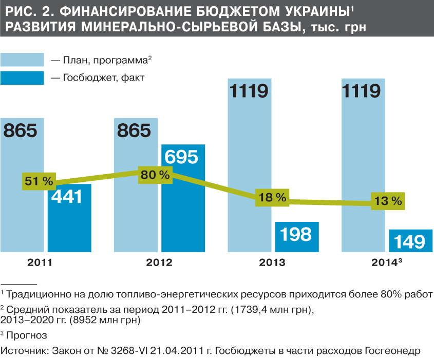 Законодательным основанием для оплаты проведения геологоразведочных работ (ГРР) за госсредства является общегосударственная программа развития минерально-сырьевой базы Украины на период до 2030 г. Анализ первых лет ее внедрения свидетельствует о критическом недофинансировании геофизиков госучреждений, которые фактически перестали проводить какие-либо изыскательские работы "в полях". Недостаточные объемы ГРР проводят и коммерческие компании на своих лицензионных участках. Так, в 2013 году было отмечено резкое падение объемов бурения, прежде всего за счет сокращения работ предприятиями НАК "Нафтогаз Украины" (в основном это подразделения "Укргаздобычи" и "Укрнафты").