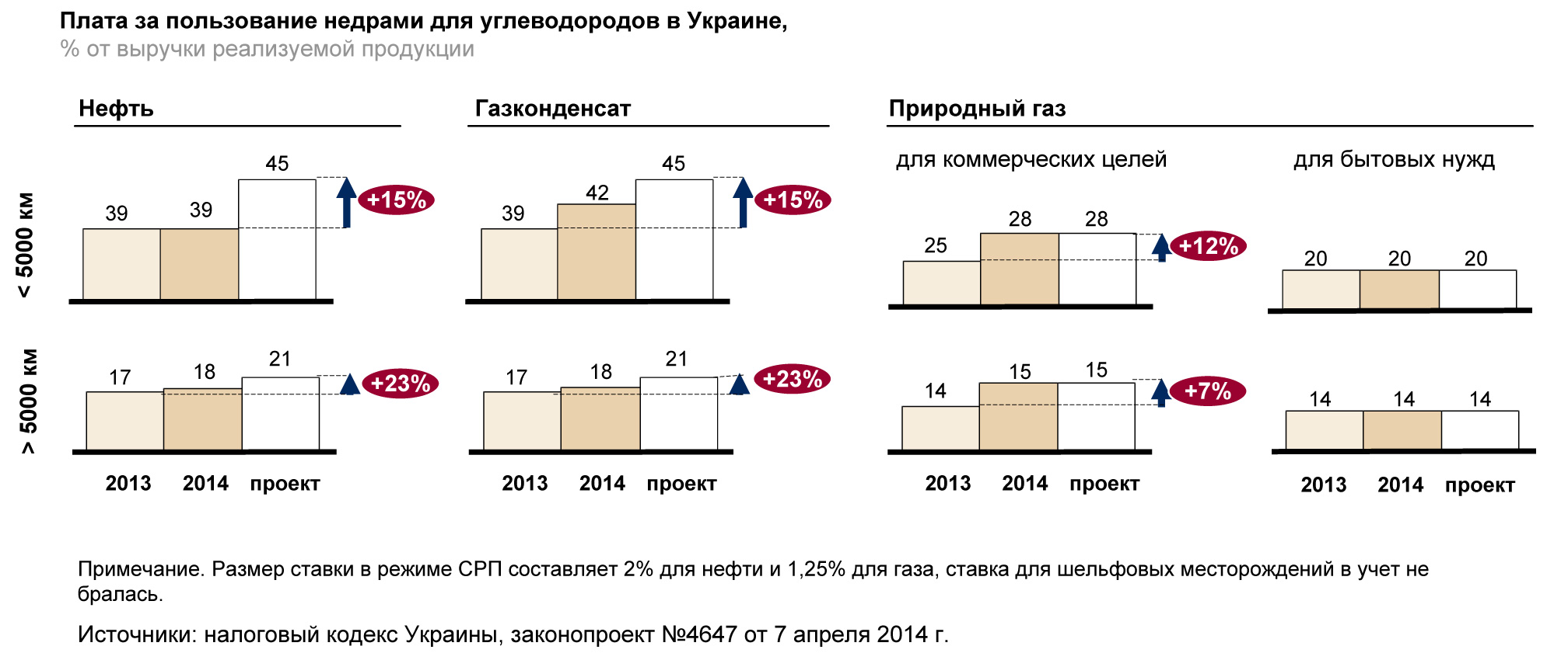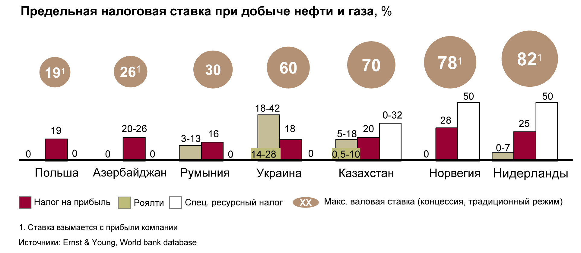 Текущая максимальная рентная ставка в Украине (28% для газа и 42% для конденсата) превышает ресурсный налог в соседней Румынии (13%) и Казахстане (от 18% для переработки нефти внутри страны и до 50% при ее экспорте).