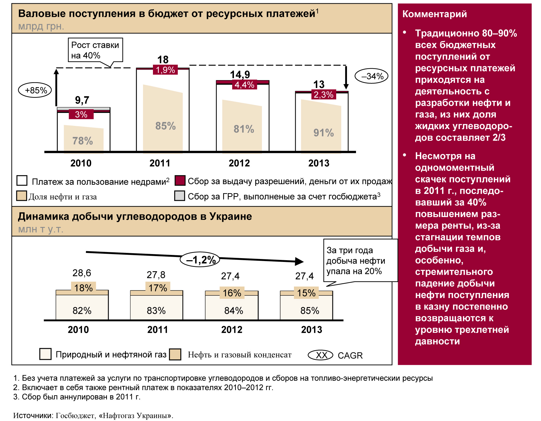 В этом контексте существенный рост рентных платежей противоречит продуктивной философии, так как крайне негативно влияет на нефтегазовую отрасль. Последствием чрезмерного фискального бремени являются сокращение оборотных средств добывающих предприятий и, как следствие, падение производства, увеличение импорта, уход частных инвесторов из отрасли. В подтверждение этого тезиса ниже приведена динамика поступлений в госбюджет Украины от ресурсных платежей и темпы добычи углеводородов в 2010–2013 гг.