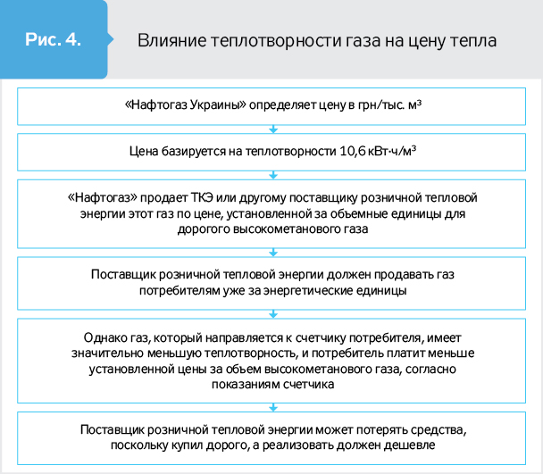 Нынешняя схема такова, что заставляет поставщиков тепла для отопления зданий изыскивать пути повышения цены для потребителей тепла, которые получают газ в зависимости от показаний их счетчиков, то есть в гривнях за гигакалорию или гигаджоуль (см. рис. 4).