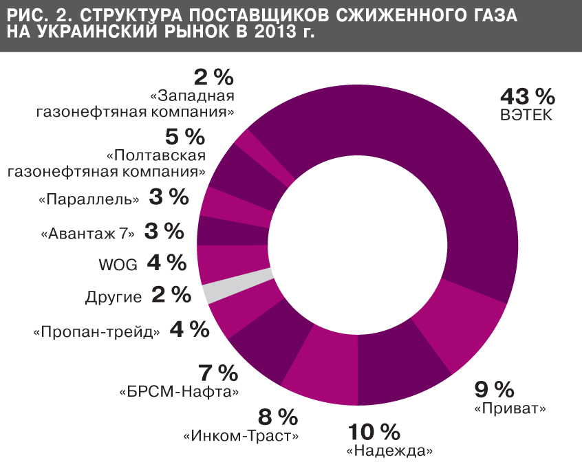 Горячо было и на внутреннем рынке. Среди основных событий - потеря позиций на оптовом рынке сжиженного газа группой компаний ВЕТЭК. Дело в том, что основные поставщики группы - ОАО "Укрнафта", ПАО "Укртатнафта" и ПАО "Укргаздобыча" по разным причинам сократили свои продажи сжиженного газа. Впрочем, это не помешало ВЕТЭК сохранить за собой в 2013 г. статус крупнейшего игрока с оценочной долей около 43% поставок.