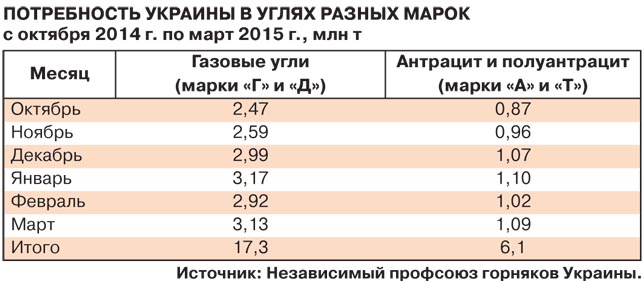 По данным главы Независимого профсоюза горняков Украины (НПГУ) Михаила Волынца, для прохождения осенне-зимнего периода отечественной энергетике понадобится до 6 млн т антрацитовых и полуантрацитовых групп углей. Скорее всего, за счет принудительно-вынужденной экономии и возможного сокращения сроков отопительного сезона в Украине итоговая сумма сожженного ТЭС и ТЭЦ угля окажется меньше, но все равно речь идет об огромных объемах (см. табл.).