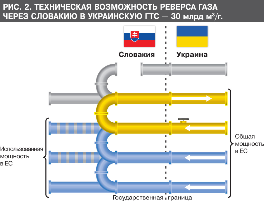 "Мы просим не виртуальный, а реальный реверс, но на равных со всеми условиях", - заявил А.Коболев. По сути, вариант, на котором настаивает Украина, позволяет получить через ГТС Словакии доступ к европейскому рынку, объем которого несоизмерим с нынешними реверсными ручейками в Украину, и реверс может составить до 30 млрд кубометров газа в год (см. рис. 1). Причем при обоюдном согласии сторон этот вариант можно реализовать в течение нескольких недель.