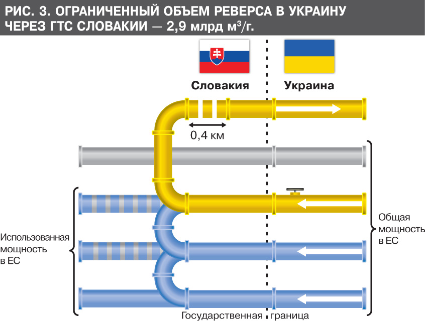 Как напомнил глава "Нафтогаза" А.Коболев, в 2011 г. именно Словакия предлагала вариант, каким образом Украина может получать газ из Словакии по реверсной системе. Но теперь она не соглашается на такой вариант, поскольку направление газа контролирует "Газпром". Словакия готова обеспечить реверс в Украину только 2,9 млрд кубометров газа в год (см. рис. 3). Для этого она предлагает достроить 300–400 м неиспользуемого сейчас газопровода. И словаки рассчитывают, вероятно, что оплатит это строительство если не Украина, то ЕС. Это условие, по информации ZN.UA, было внесено в Меморандум о взаимопонимании. Там указаны и сроки строительства, и другие процедуры. А сам газомаршрут должен был начать работу уже в октябре 2014 г.