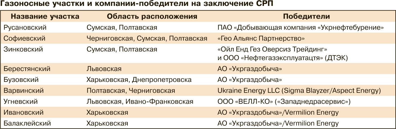 Следует отметить, что отбор победителей конкурсов по девяти СРП прошел исключительно дипломатично. Межведомственная комиссия по отбору победителей СРП решила раздать "всем сестрам по серьгам". Из девяти конкурсов государственная компания "Укргаздобыча" получила больше всего участков - два самостоятельно и два в партнерстве с канадской Vеrmilion Energy, еще по одному участку получили "Гео Альянс Партнерство" (подконтрольна Виктору Пинчуку), "Ойл Энд Гез Оверсиз Трейдинг"/ООО "Нефтегазэксплуатация" (структуры ДТЭК Рината Ахметова), Ukrainіan Energy LLC (Sigma Blayzer/Aspect Energy), ООО " ВЕЛЛ-КО" (структура "Западнедрасервис" Зиновия Козицкого) и "Укрнефтебурение" (владельцы - Игорь Коломойский и Виталий Хомутынник).