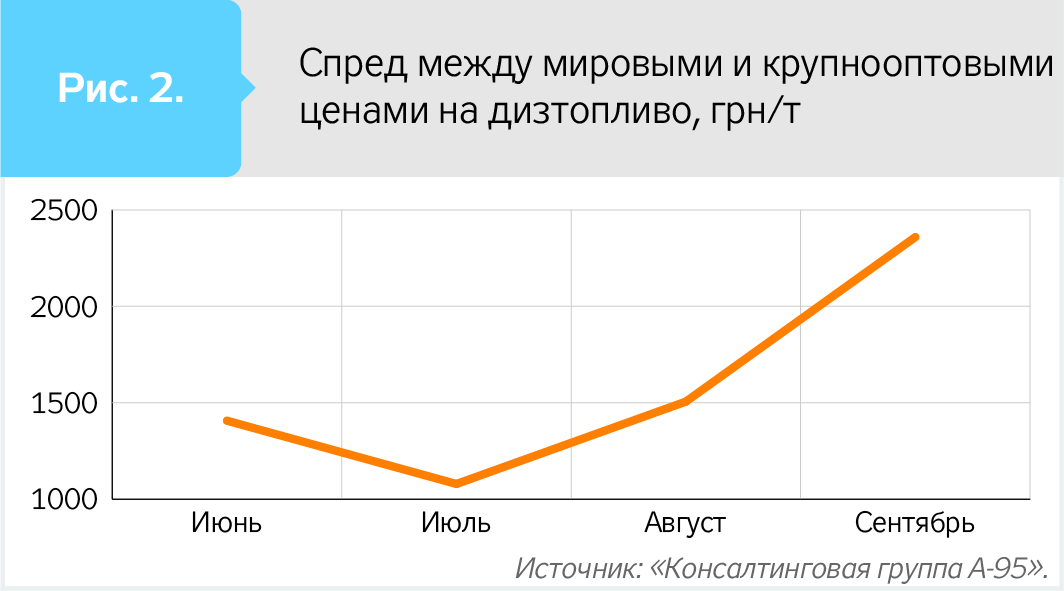 Дефицит дизельного топлива в сентябре оценивается в 60 тыс. т, или 10% от ожидаемого объема потребления в Украине. Отмечу, что осенью 2018-го вдвое меньший дефицит привел к взлету оптовых цен, обнулению оптового предложения на рынке и тихой панике. Все это уже есть сегодня. Сравнение динамики мировых и оптовых цен в Украине показывает, что спред между ними в сентябре резко вырос, что указывает на рост "ажиотажной" (в миру ее, как правило, называют спекулятивной) составляющей (см. рис. 2).
