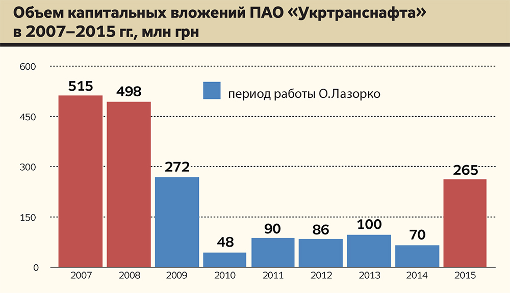 В целом хозяйство "Укртранснафты" представляет собой унылое зрелище. Дело в том, что за время правления Лазорко, несмотря на завидные, как по нынешним временам, объемы транспортировки нефти, инвестиции в развитие и модернизацию системы упали в 20 раз - со 100 млн долл. в 2007 г. до 5 млн в 2014-м.
