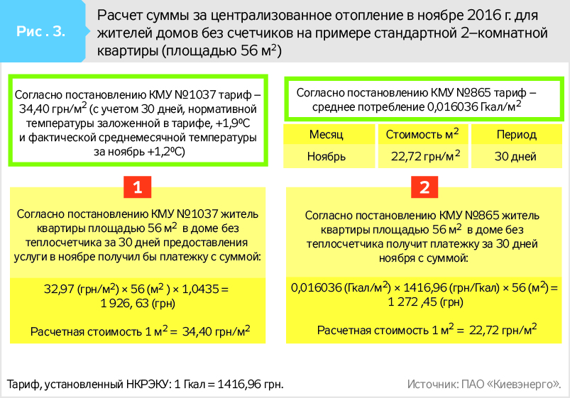 56 кв. м наглядно показана разница расчета стоимости отопления 1 кв. м, которая после введения в действие постановления правительства №865 от 9 декабря 2016 г. сократилась с