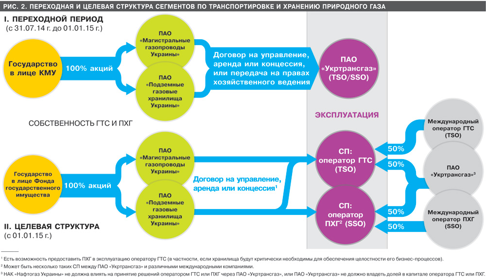 В ближайшей перспективе предполагается, что "Укртрансгаз" будет арендовать транспортные мощности и мощности по хранению газа у создаваемых ПАО "Магистральные газопроводы Украины" и ПАО "Подземные газовые хранилища Украины". Но для понимания предлагаемой реформы всего газового рынка надо разделять функции, юридические и финансовые структуры.