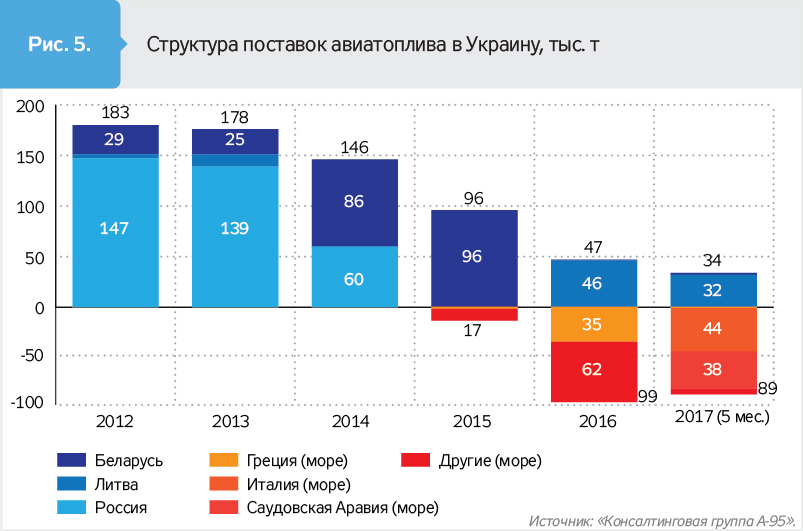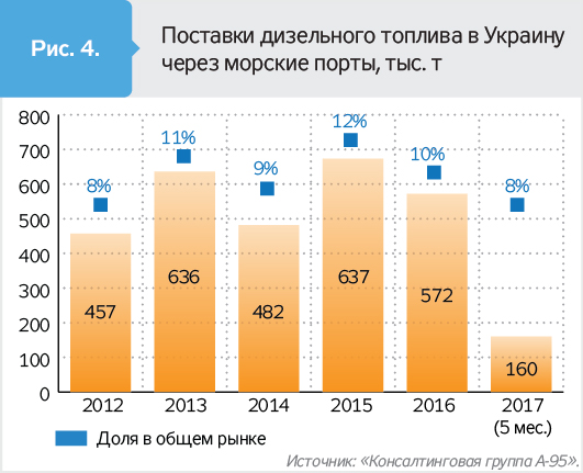 Возвращаясь к основной теме материала - морской перевалке, отметим, что касательно нефтепродуктов речь идет исключительно об их импорте и преимущественно о двух марках - дизельном топливе и авиационном керосине. В последние три года по морю обеспечивается в среднем 10% рынка дизтоплива (рис. 4). А для поставок авиатоплива порты приобрели стратегическое значение (рис. 5): в 2016 г. с юга пришло 30% рынка (99 тыс. т) этого стратегического продукта, а за пять месяцев текущего года - уже 50% (89 тыс. т).