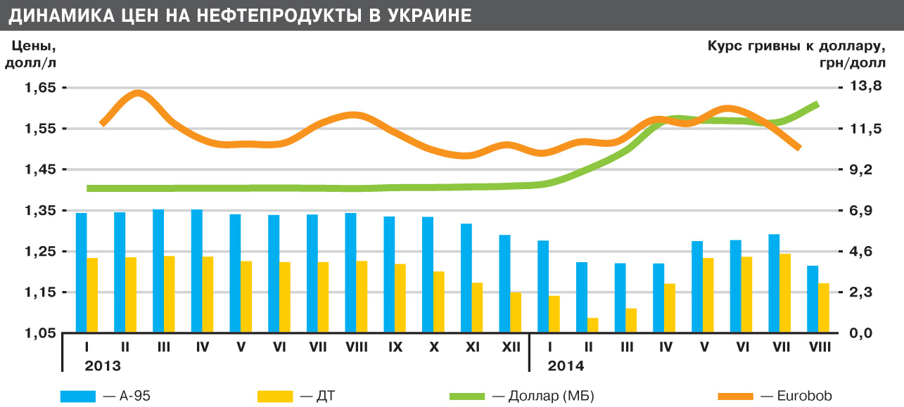 Насколько объективна такая цена? Как показывает статистика, в 2013 г. средняя цена бензина А-95 составила 1,01 евро/л, в январе-августе 2014 г. - 0,91 евро/л. По дизтопливу такое сравнение выглядит как 0,92 евро/л в прошлом году против 0,86 евро/л в этом, несмотря на то, что в апреле был вдвое увеличен акцизный сбор.