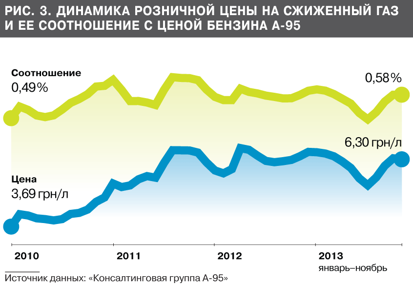 В авангарде этого процесса идет Украина. Промежуточные итоги говорят, что 2013-й обещает стать рекордным годом для украинского рынка автогаза. По оценке "Консалтинговой группы А-95", по итогам текущего года объем потребления пропан-бутана в автомобильном и коммунально-бытовом секторах может превысить