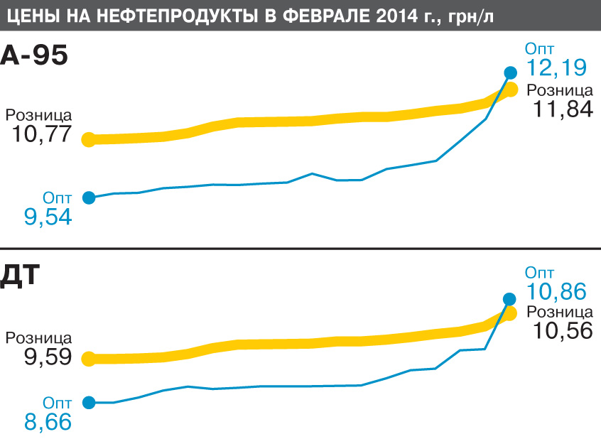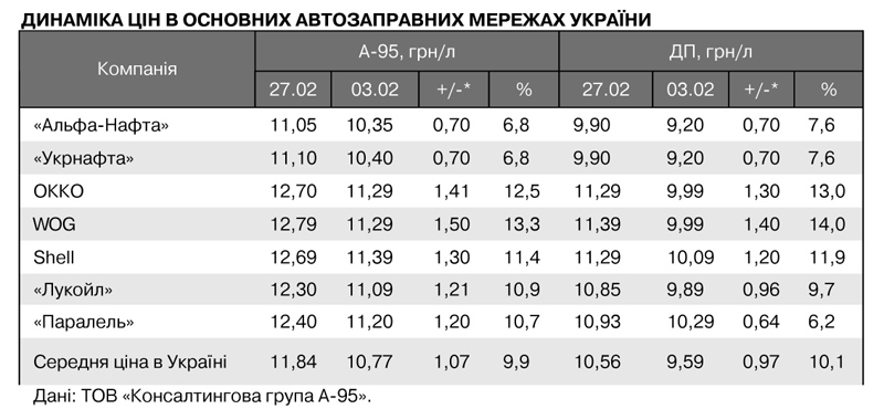 Менее быстрыми, но также крайне ощутимыми темпами повышались в конце февраля и розничные цены. По сравнению с началом месяца они увеличились в среднем по рынку на 10%, и основной рост наблюдался в последнюю неделю февраля. На момент сдачи в печать этого номера средняя цена на бензин А-95 в крупнейших сетях находилась в диапазоне 11,05–12,79 грн/л, дизтоплива - 9,90–11,39 грн/л.