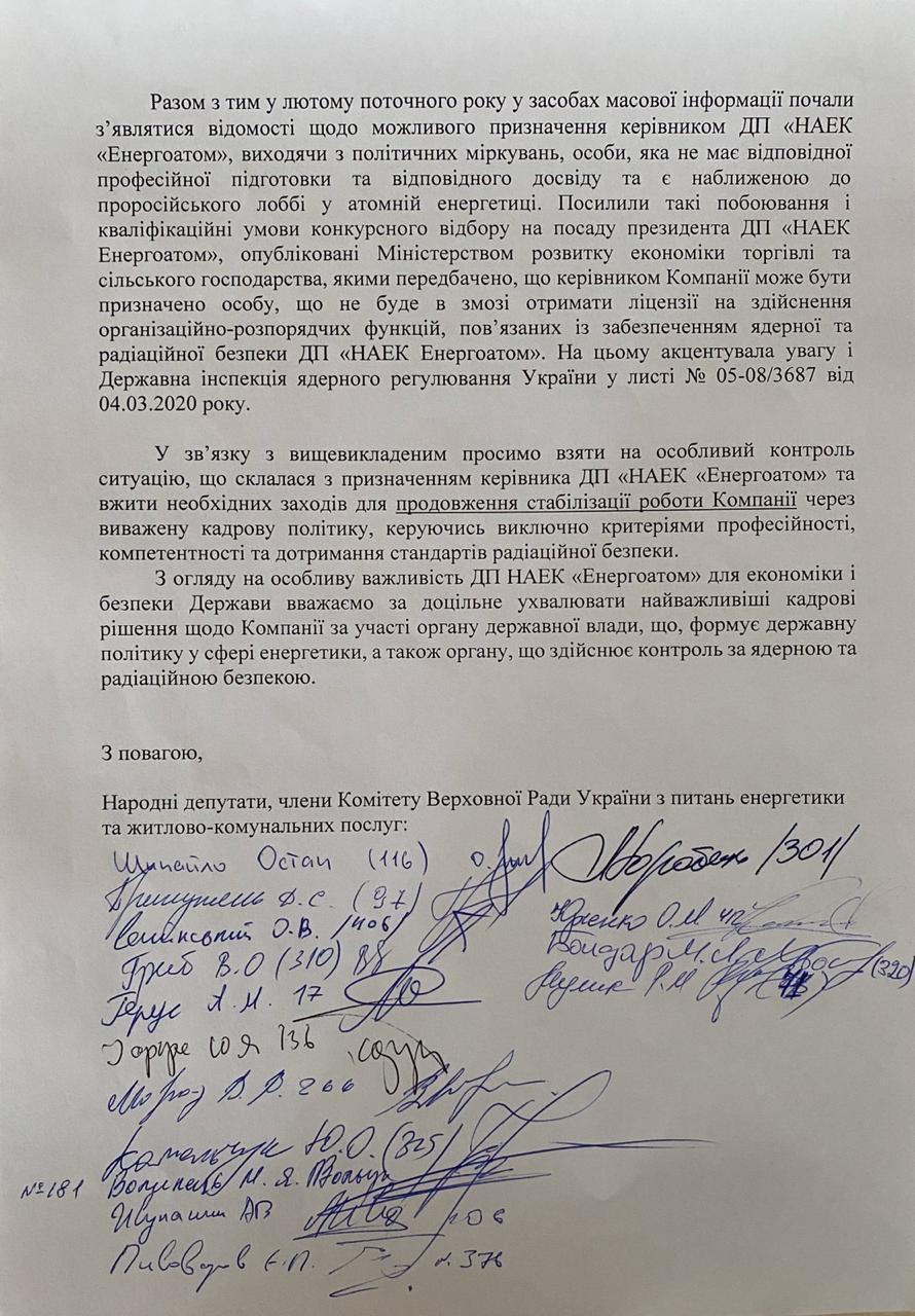После Госатомрегулирования, ссылаясь на его весомые аргументы, к руководству государства, а также в Службу безопасности Украины обратились и народные депутаты - члены комитета ВР по вопросам энергетики и жилищно-коммунальных услуг, а также избранники по мажоритарным округам, где расположены атомные электростанции. Народные депутаты отмечают, что атомную отрасль, обеспечивающую производство 55% электроэнергии в Украине, должен возглавлять действительно опытный специалист именно ядерной отрасли с соответствующим опытом работы.