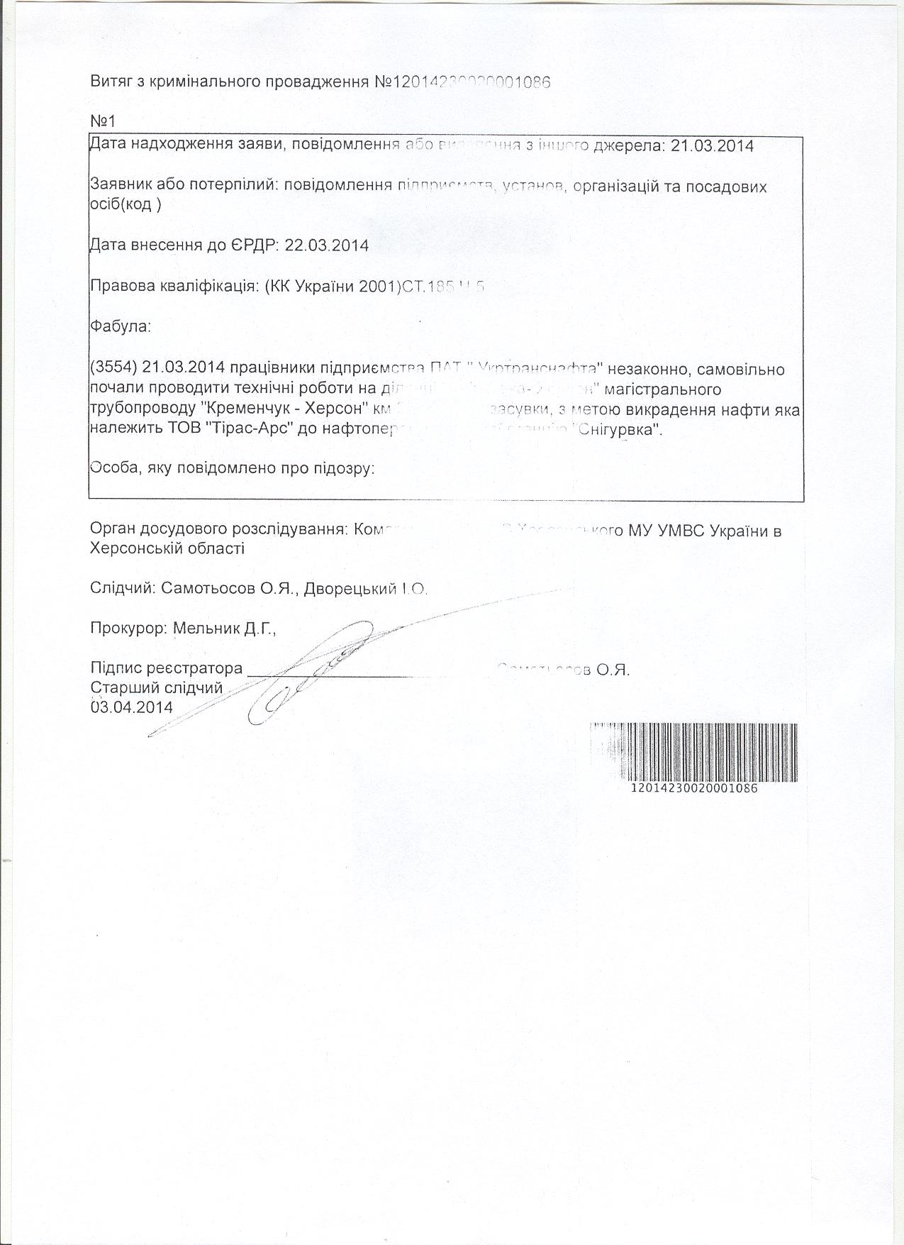 Однако есть один достоверный факт, который, скорее всего, и стал катализатором мега-аферы с технологической нефтью. Точно нет нефти в нефтепроводе Херсон-Снегиревка, который, тем не менее, фигурирует в проекте от 1 апреля. Об этом свидетельствуют материалы уголовного дела, открытого херсонской милицией по факту выкачки нефти из упомянутого нефтепровода (см. документ на сайте ZN.UA). В них указывается, что 21 марта 2014 г. неподалеку от Херсонского НПЗ две передвижные компрессорные станции начали вытеснение нефти из нефтепровода в направлении Снегиревки. За четыре дня таким образом удалось выкачать более 20 тыс. т нефти. На данный момент орудия производства "Укртранснафты" стали вещественными доказательствами. Интересно, а почему Лазорко не обращался за разрешением о выкачке данной нефти, а сделал это только 1 апреля? Может, потому, что в Херсоне хотелось сделать все по-тихому?