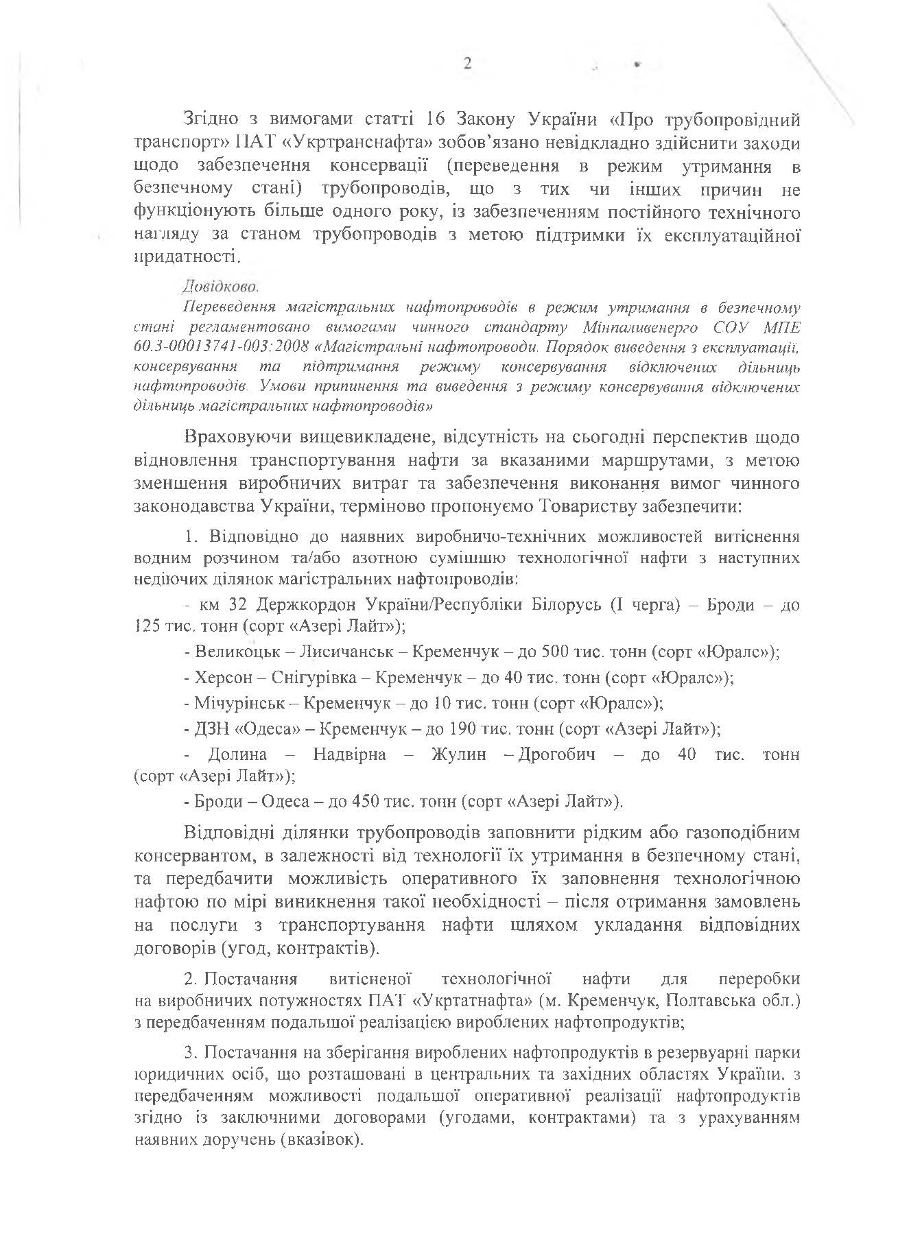 Аргументация проекта по выкачке технологической нефти по своей бездарности и наглости может сравниться разве что с подготовкой "тендера" по покупке "вышек Бойко" (что впоследствии и сгубило махинаторов). Необходимость опустошения трубопроводной системы аргументируется заботой о состоянии нефтепроводов и выполнением требований Закона "О трубопроводном транспорте". Согласно ему "Укртранснафта" якобы обязана предпринять меры по консервации нефтепроводов, которые не функционируют более года. К таковым на сегодняшний день относятся все нефтепроводы, за исключением нефтепровода "Дружба". "Укртранснафта" предлагает заместить нефть водной и/или азотной смесью.