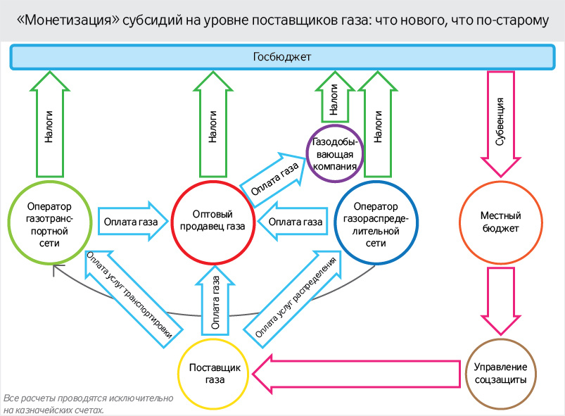 Ныне действующему механизму финансирования субсидий на газ и тепло уже более десяти лет. Ключевой его признак - жесткая иерархическая структура расчетов по замкнутой цепи, в которой сумма средств, вышедшая из государственного бюджета на финансирование субсидий, равняется сумме налогов, уплаченных участниками расчетов в государственный бюджет. При этом средства по казначейским счетам участников расчетов проходят буквально за день и возвращаются в государственный бюджет.