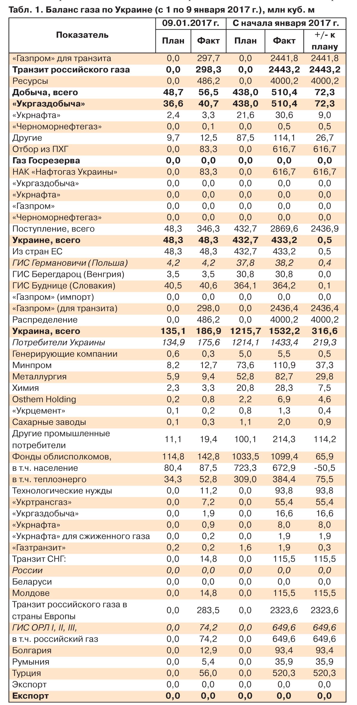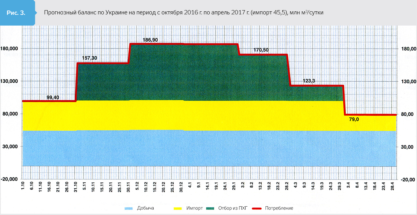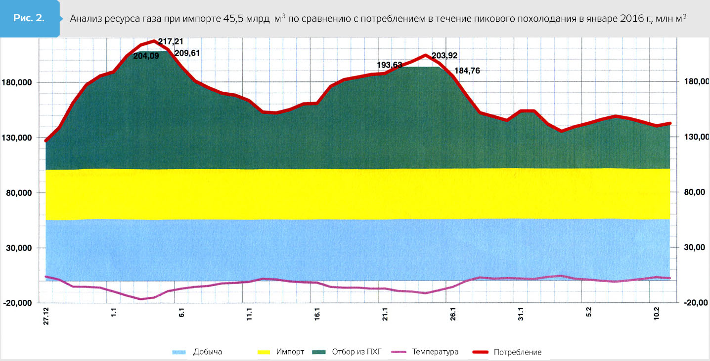 Впрочем, газотранспортники и НАКовцы просчитывали не один вариант. Например, вполне комфортный - при импорте 45,5 млн кубометров/сутки. Проанализировав динамику потребления в пиковый период января 2016-го, составили прогнозный баланс газа по Украине на период с октября 2016 г. по апрель 2017 г.. Стоит заметить, что только с 5 января нынешнего года фактическое потребление газа по стране немногим превысило 48 млн кубометров/сутки. При этом пришлось поднимать из ПХГ около 70 млн кубометров/сутки, как это было, например, 11 января. В хранилищах при этом осталось 11,303 млрд кубометров. Добыча и импорт газа стабильны, несмотря на похолодание и увеличившийся в связи с этим спрос на газ.