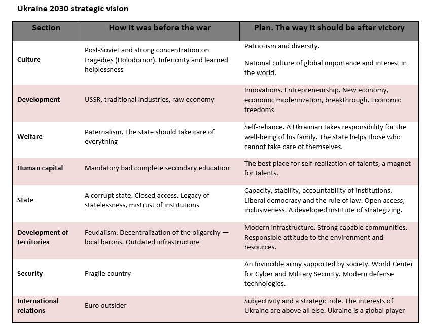 The re-establishment of Ukraine, namely, new social arrangements can be based on what unites us. Namely, to unite everyone – both those who are at the front and those who are abroad, different in age and experience. After all, history (and even the experience of participating in reforms) divides our people. While the desire for a better future unites it.