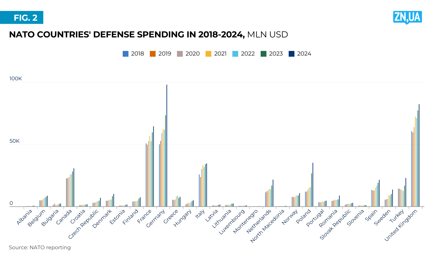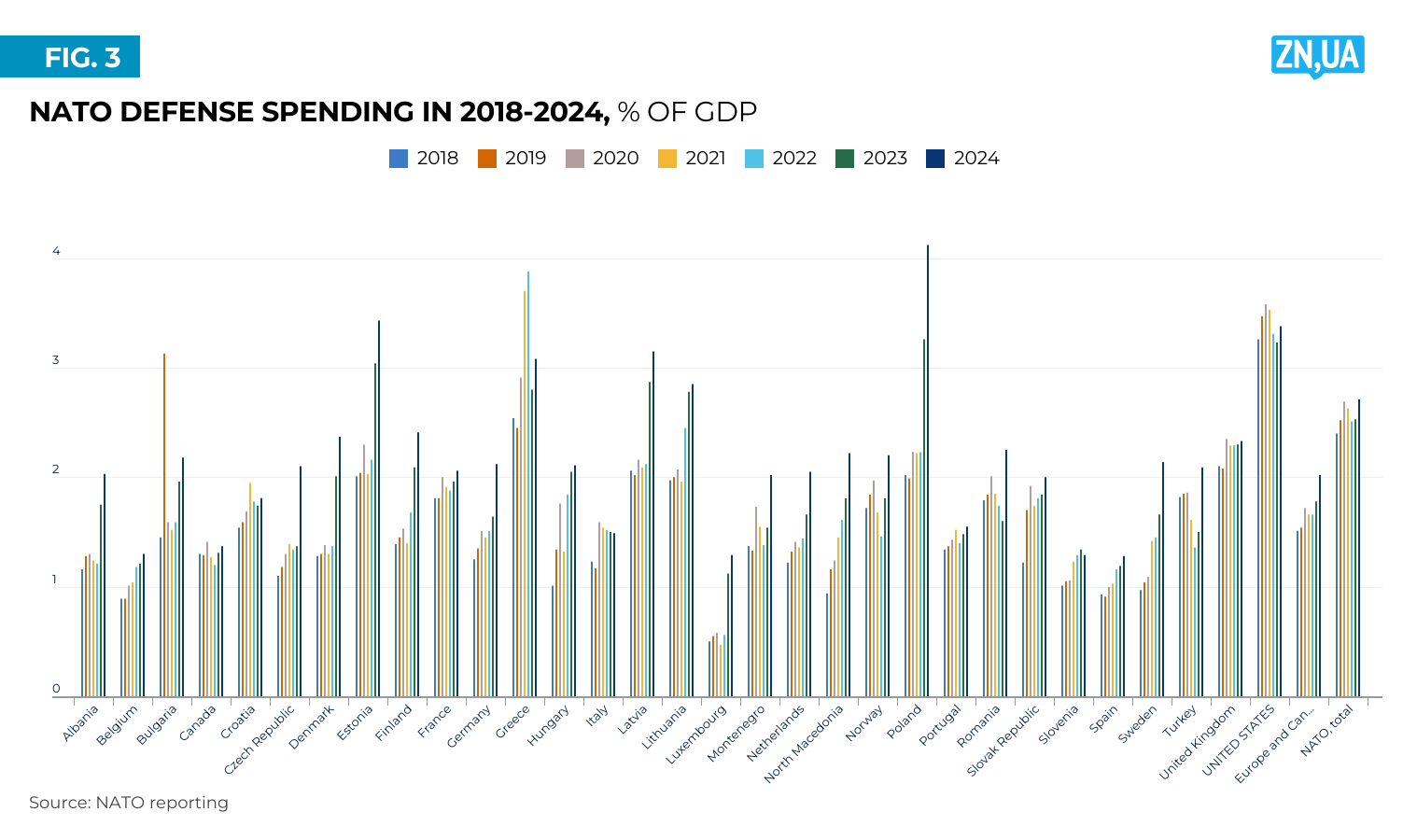 Does NATO have even a vague chance of reaching defense spending of 5% of GDP in the coming years? In general, obviously not, but some countries may try to meet this promising standard. Let's look at the infographic based on NATO’s own reports (see Figures 1–3).