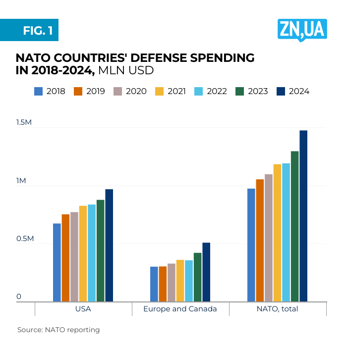 When the US president-elect suggests that Europeans spend 5% on defense, it would be logical to assume that the United States already spends that much and only wants to force its allies to do the same. But this is not the case. Although US defense spending has been growing steadily since at least 2018, it is doing so at roughly the same rate as GDP. The United States spent $782 billion on defense out of $2,357 billion of GDP in 2023 and $842 billion out of $2,781 billion of GDP in 2024 (forecast data). This is only 2.86 and 2.93% of GDP, respectively. NATO reports provide slightly different data on the defense spending of its most valuable member: $875.6 and $967.7 billion in 2023 and 2024, i.e. 3.2% and 3.36% of GDP, which is still quite far from 5%. Of course, the Americans can always rightly point out that the war is on the European continent, not across the Atlantic, but this claim still does not seem entirely fair.