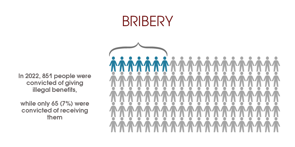 In fact, it is the opposite: in 2022, 851 people were convicted of giving illegal benefits, while only 65 were convicted of receiving them. This is obviously due to the fact that it is easier to provide the indicators of “struggle” through video recording, in particular by police and customs officers, of the facts of offering them illegal benefits than to obtain evidence of the criminal activity of bribe-takers in positions using complicated methods.