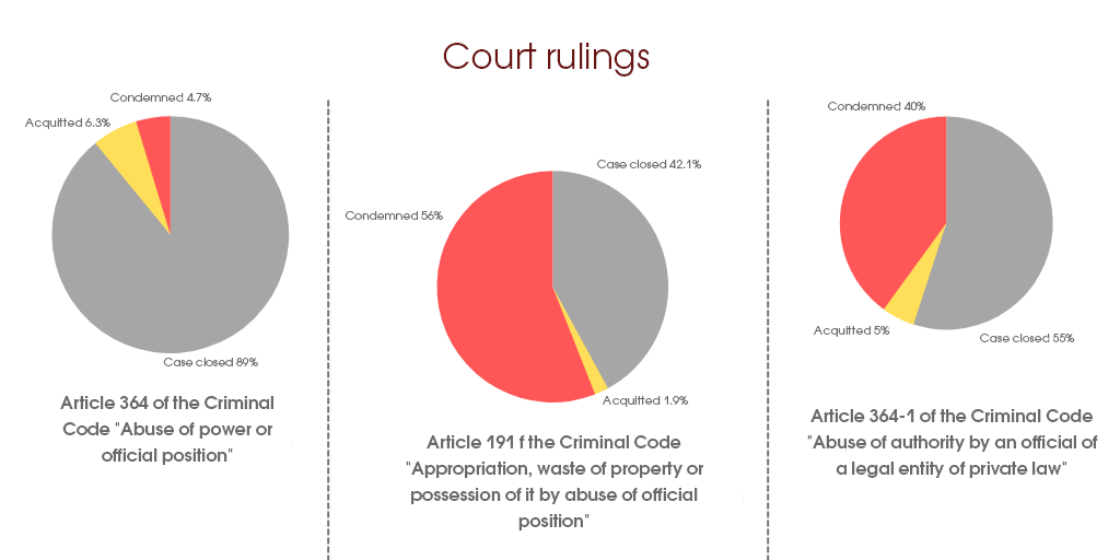 One cannot help but be surprised by the fact that out of 64 persons in respect of whom the courts issued judgments under Article 364 of the Criminal Code (abuse of power or official position), 57 were ordered to close criminal proceedings, four were acquitted, and only three were convicted (less than 5%; on the other hand, there are much more guilty verdicts against persons convicted under Article 185 (theft) — 71%).
