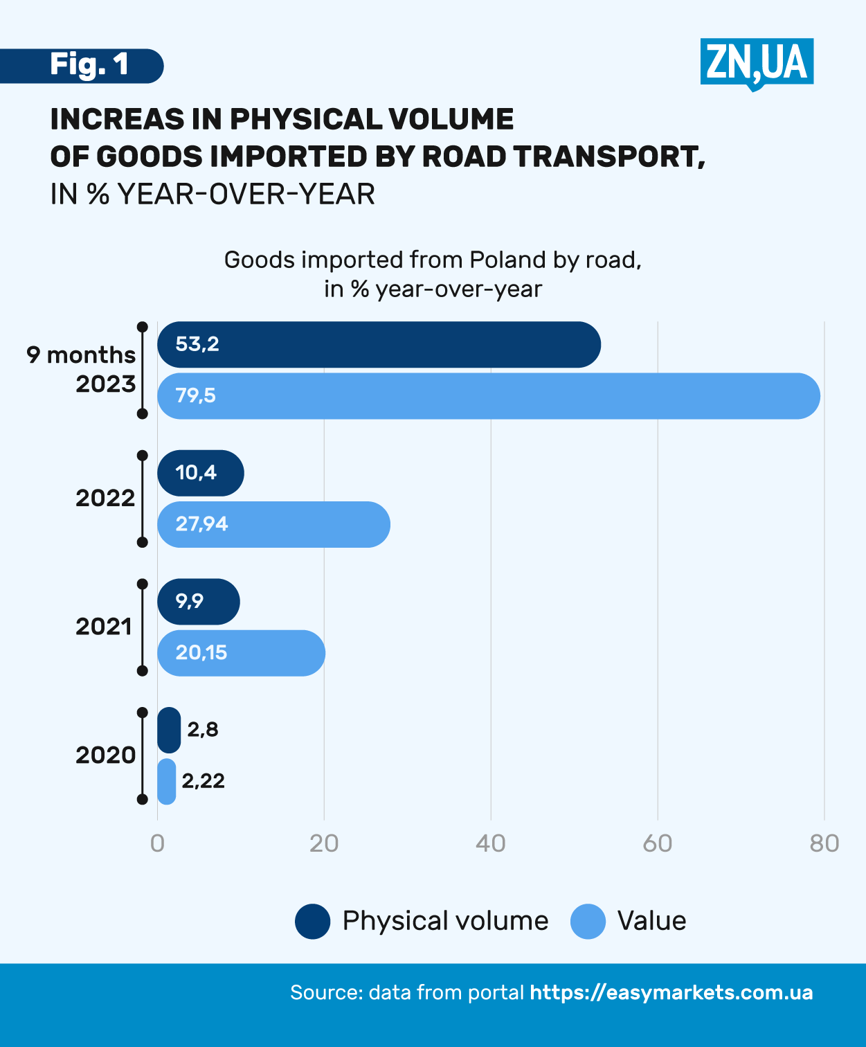 According to the EasyMarkets analytical resource, the export of goods by road transport to Ukraine from the territory of Poland (that is, our imports) in the nine months of this year increased by 53% in physical volumes compared to the same period in 2022 (see Picture 1). Revenues of exporters increased by 57% compared to the three quarters of the previous year and by 79% compared to the same period in 2021.